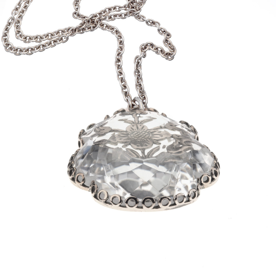 Collana con pendente forgiato a motivi floreali e una pietra di cristallo di rocca sfaccettata incastonata sopra.