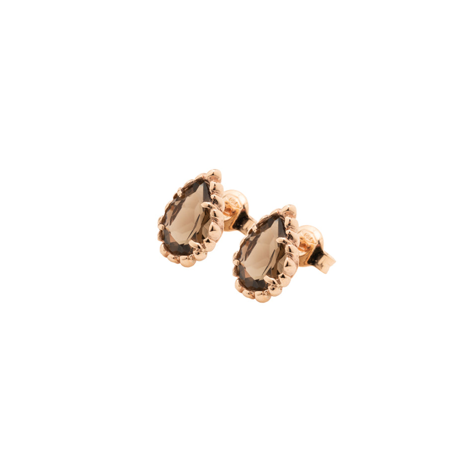 Orecchini a lobo in oro rosa, impreziositi da una pietra naturale taglio goccia in quarzo fumè che cattura la luce con eleganza e delicatezza.