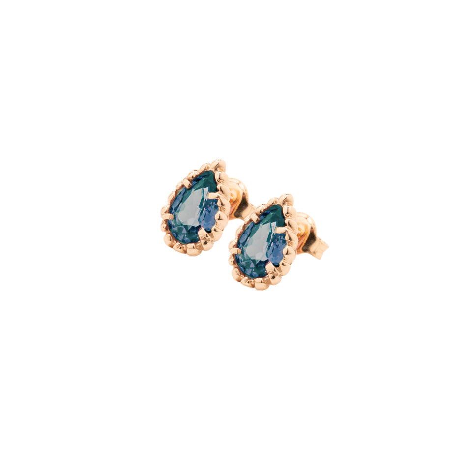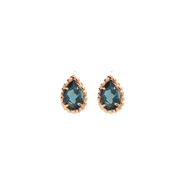 Orecchini a lobo in oro rosa, impreziositi da una pietra naturale taglio goccia in topazio blu London che cattura la luce con eleganza e delicatezza.