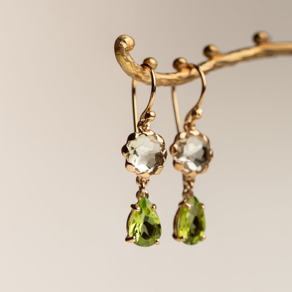 Orecchini pendenti con prasiolite verde chiara rotonda incastonata a fiore e peridoto verde brillante a goccia con griffes. L’accostamento delle due pietre naturali crea un elegante accordo cromatico, delicato e al contempo deciso.