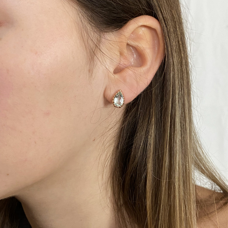 Orecchini a lobo in oro rosa, impreziositi da una pietra naturale taglio goccia in prasiolite che cattura la luce con eleganza e delicatezza.