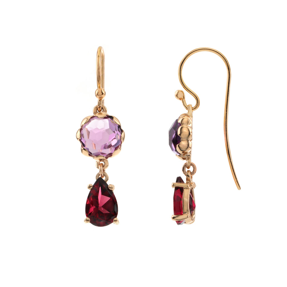 Orecchini pendenti con ametista rosa di Francia rotonda incastonata a fiore e rodolite rossa a goccia con griffes. L’accostamento delle due pietre naturali crea un elegante accordo cromatico, delicato ma deciso.